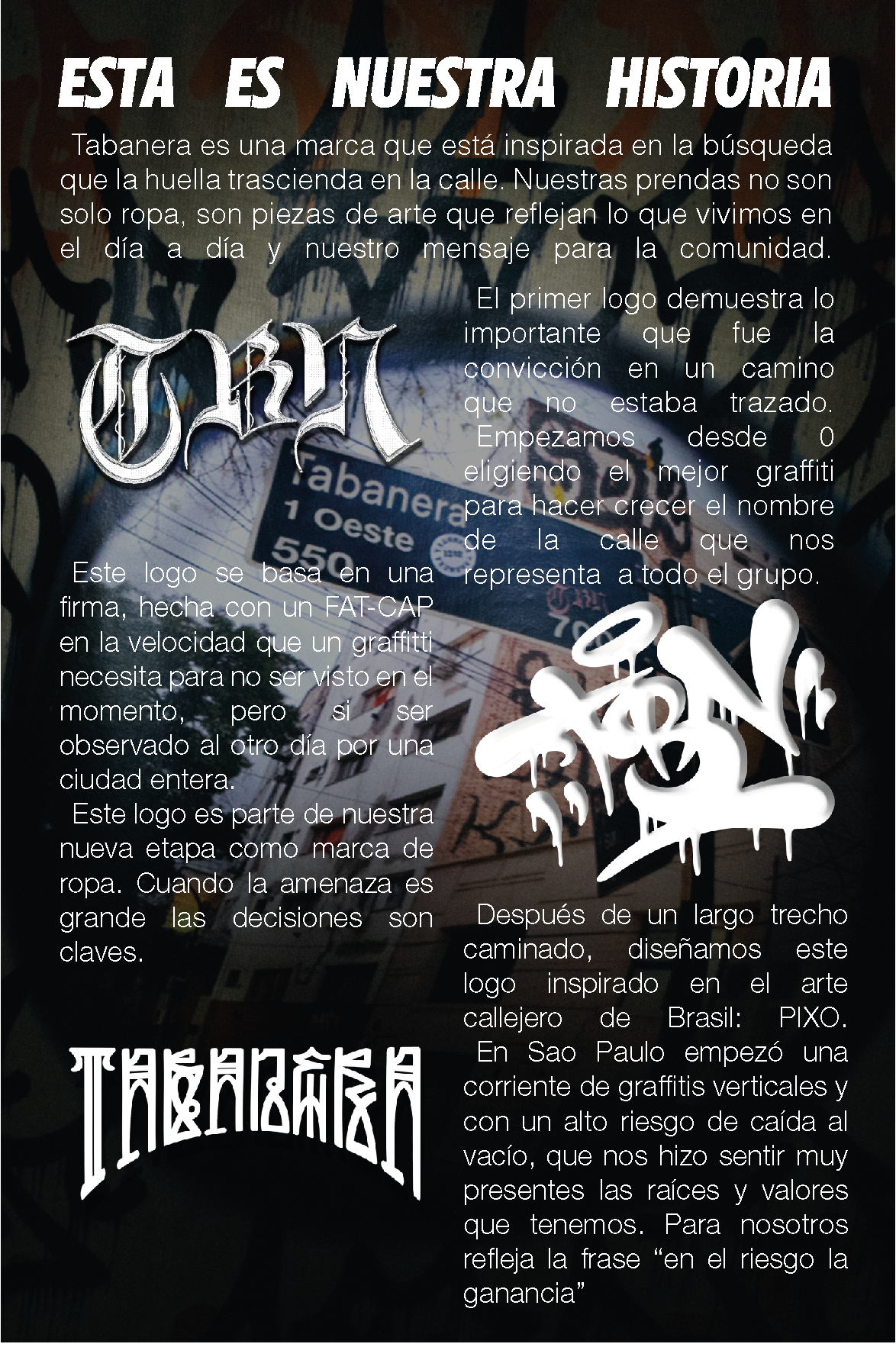 En la Tabanera, el diseño nace de nuestra historia y de su trascendencia. Mostramos lo que se vive en una CREW. El verdadero por amor al arte, donde la creatividad cruda, el mensaje y la expresión, son nuestra huella.